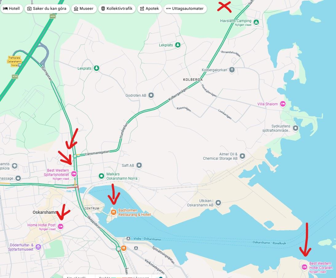 Sjöfartshotellet Best Western. Ligger precis norr om centrum, ca 2,5km till logen.